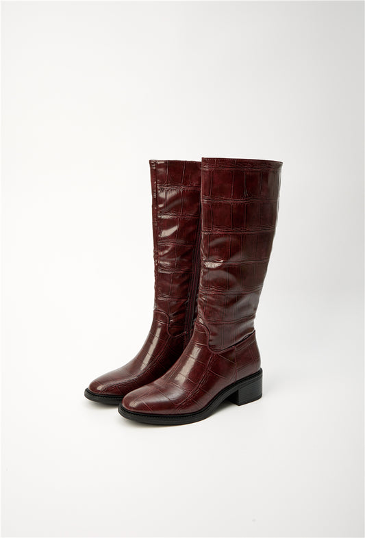 Bottes à petit talon en similicuir effet croco, bordeaux