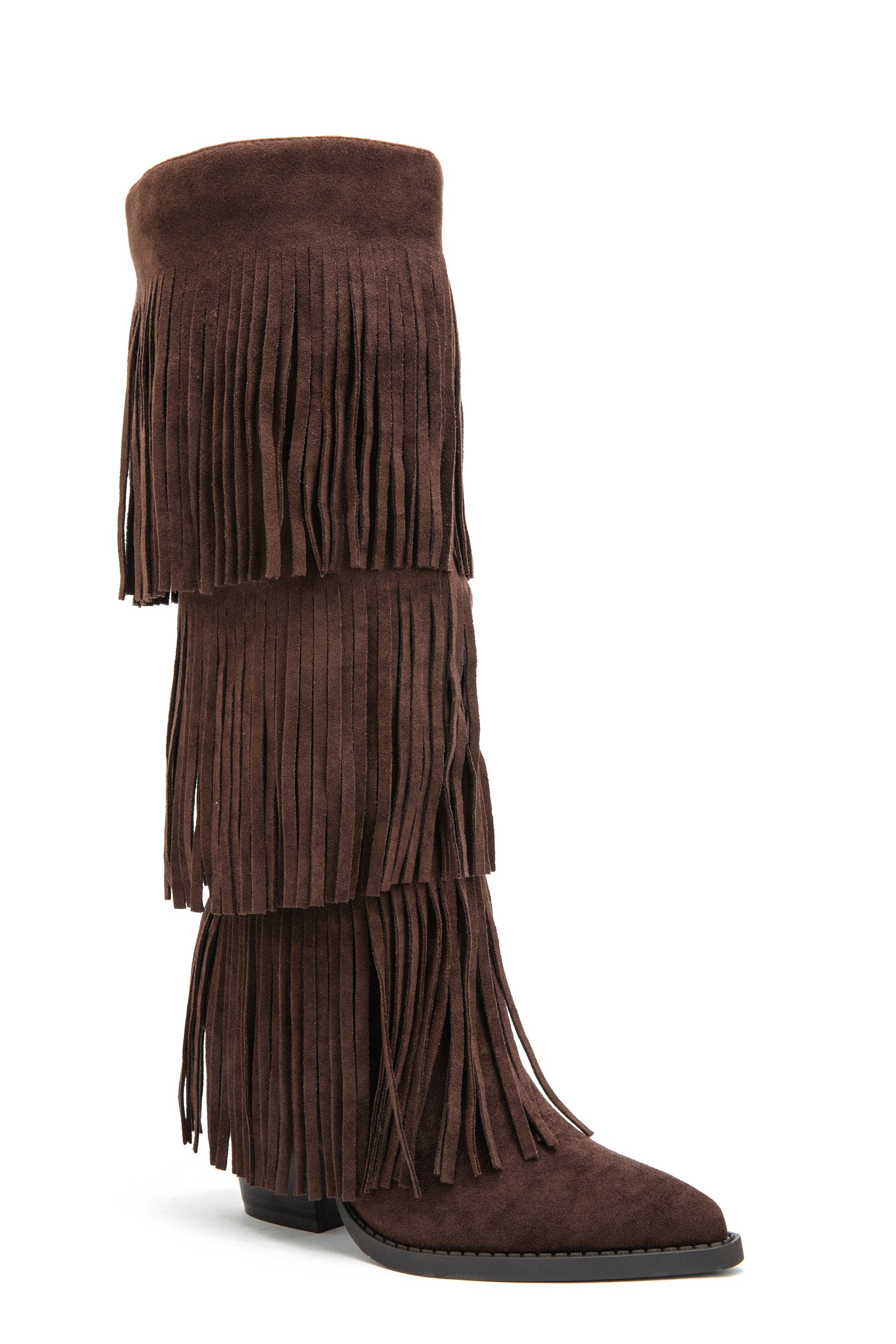 Superbes Bottes de style cowboy en simili-daim couleur Marron foncé chocolat, avec jolies franges sur le tige, Bout pointu Talon carré mi-haut, parfaites pour une femme qui embrasse pleinement son style unique.