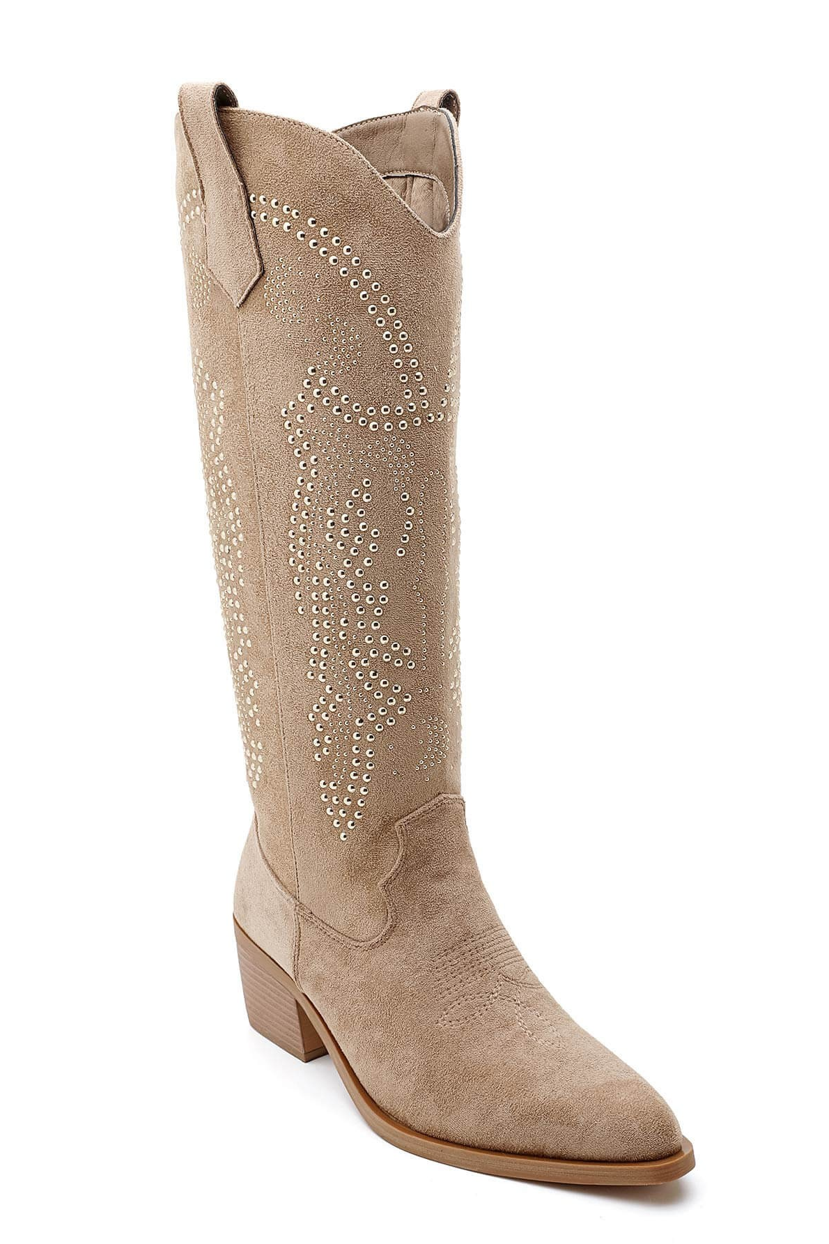 Superbes Bottes de style cowboy en simili-daim couleur Taupe, avec strass détails brodés, Bout pointu Talon carré mi-haut, parfaites pour une femme qui embrasse pleinement son style unique.