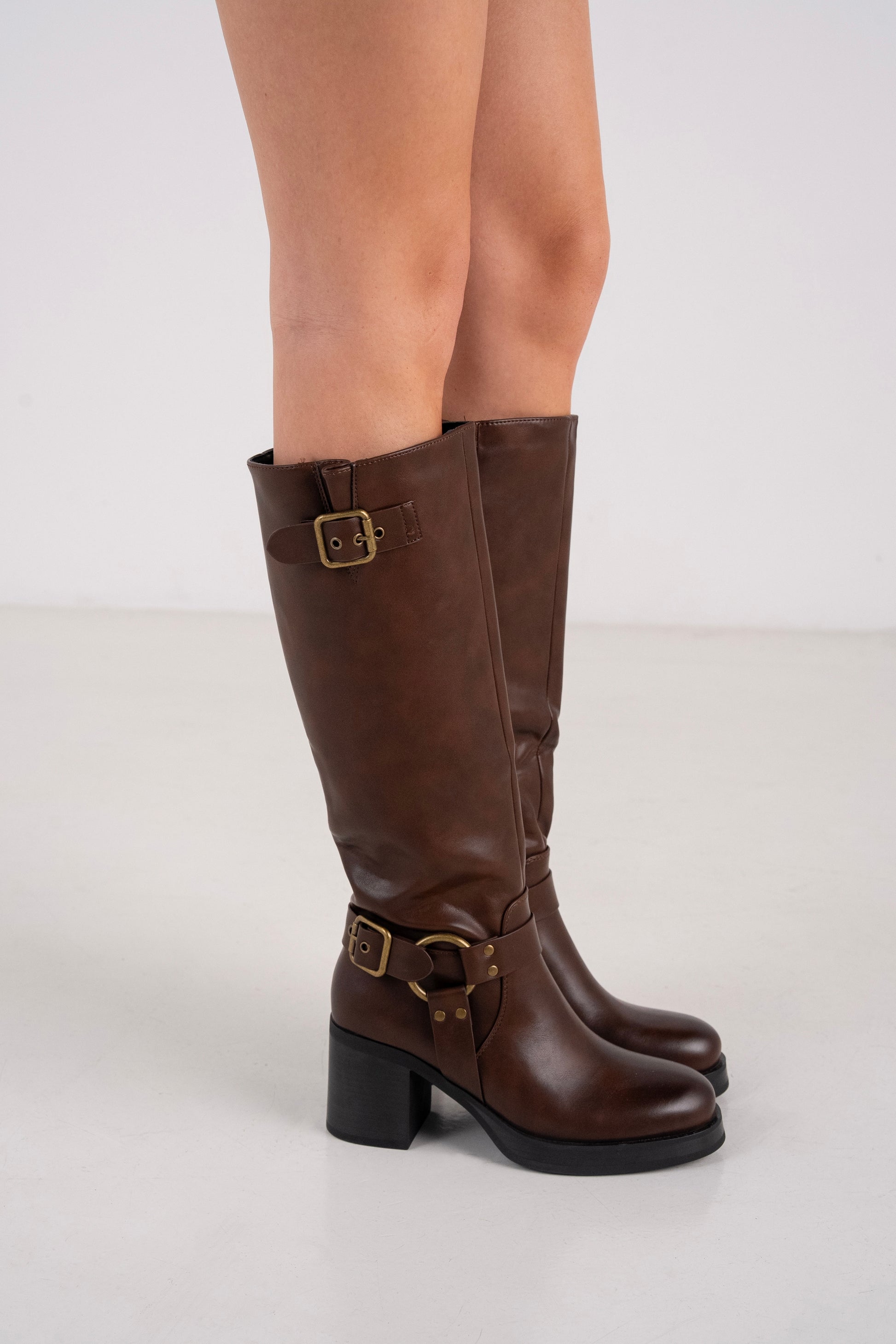 Indémodables, les bottes cavalières/motards sont un must-have du vestiaire ! Ces bottes marron motards / cavalières élégantes et robustes se distinguent par leur sangle décorative dorée à anneau, parfaite pour ajouter une touche chic à vos tenues hivernales. Dotées d’un talon épais de 6 cm et d’une plateforme de 2,5 cm, elles garantissent un confort optimal tout en allongeant la silhouette.
