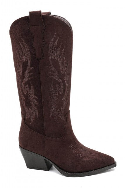 Superbes Bottes de style cowboy mi-haute en simili-daim couleur Marron foncé chocolat, en suédine et broderie sur la tige. Bout pointu Talon carré mi-haut, parfaites pour une femme qui embrasse pleinement son style unique.