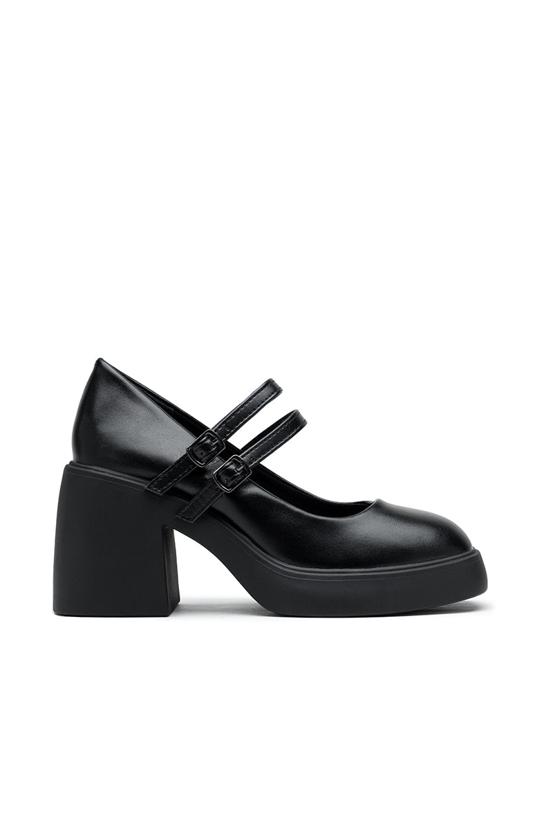 En matière synthétique déclinée en coloris Noir mat, ces babies plateforme à talons bloc affirment son caractère par une finition très réussie, idéale pour revendiquer un style tendance.
